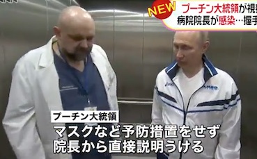 JUGEMテーマ:ロシア 新型コロナウイルスの感染者が入院する病院で、ロシアのプーチン大統領を案内した病院長が、その後ウイルスに感染していたことがわかった。接触のあった大統領は感染していないという。病院の入り口でプーチン大統領を握手して出迎える院長。先月24日、プーチン大統領はモスクワ市内の感染症の病院を院長の案内で視察した。プーチン大統領は(略)政権幹部らと共にマスクなどの予防措置をせずに院長から直接説明を受けている。(略) https://headlines.yahoo.co.jp/videonews/nnn?a= 20200401-000...