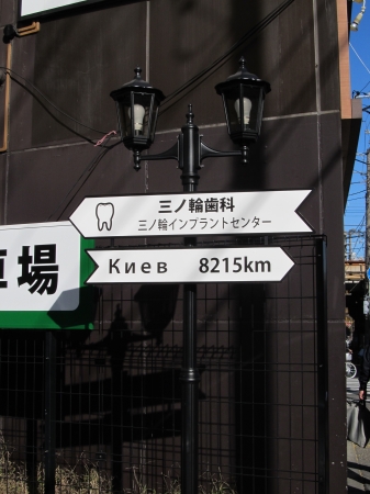 JUGEMテーマ:ロシア もはや「ロシア」の領土ではないのでありますけれど、まけといて!いただきまして。 都電の三ノ輪橋停留所付近で見かけた表示板。 上の歯医者さんのほうはスルーしていただいてよろしいのですが、問題は下の矢印。 キリル文字(ロシア語)で「キエフ」と書いてあるのです。たぶん。 此の場に立って、方位磁石を手にされますならば「よっしゃ、8215キロなんて、チョロイもんだわ!」と呟かれますことは必定。 明石大佐やデルス・ウザーラよりも長途で過酷なサバイバルツアーが始まるのでございます...