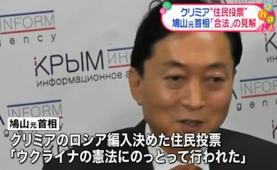 JUGEMテーマ:ロシア ロシアが一方的に編入したウクライナ南部のクリミアを訪れている鳩山元首相は11日、ロシアへの編入を決めた住民投票は「合法」だとして、日本政府とは異なる見解を示し(略)住民投票は憲法に違反しているとする日本政府とは異なる見解を示した。この住民投票をめぐっては、ロシア側は約9割の住民が賛成したためクリミアを編入したとの立場で、国際社会から批判が上がっている。ロシアの国営テレビなどは鳩山元首相の「住民投票は合法だ」という発言を繰り返し伝えており、クリミアのロシア編入を正当化す...