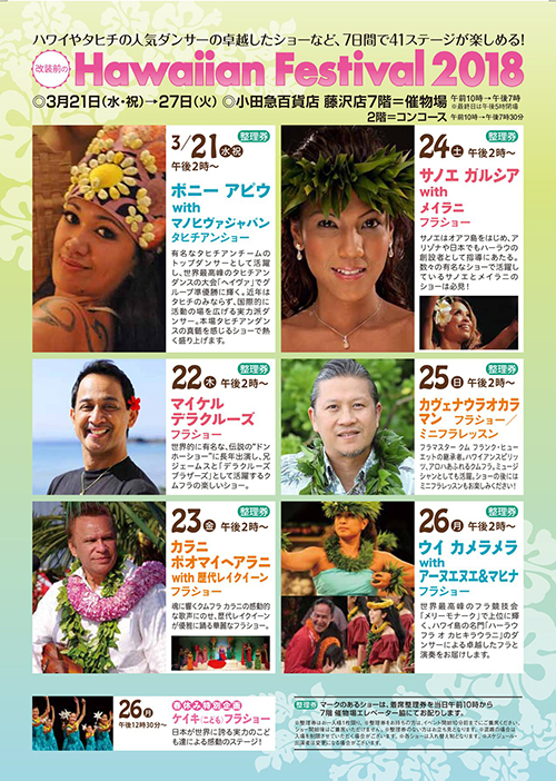 〔イベント☆小田急百貨店 藤沢〕今年もイベントシーズン到来しました! 来週の春分の日から 小田急百貨店 藤沢店で今年最初の ハワイアンフェスティバルが開催されます! 豪華な出演者がハワイから来日されますので ぜひ、一足早く熱いフラをお楽しみください〜 ハワイのマラサダやスパムなどのフードや ハワイアン雑貨も充実しておりま〜す! Lani Hawaii〔ラニハワイ〕からも ピカケ、イリマ、オヒアレフア、ティアレ などのハワイのお花や ティ...