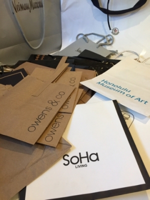 JUGEMテーマ:ハワイ 買い物するとレジで 袋いるかと訊かれること多々。 スーパーなどはエコバッグ持参が当たり前になってるから 今回の旅で収集した紙袋、 これっぽっち。 百貨店や専門店のちゃんとした紙袋が 却って過剰に感じるよー だから ニーマンマーカスのトートバッグと立派な厚手の紙袋が 色もサイズも似てると気づいて ツボに入っちゃうww こんなに似てるなら ゴールドの方がよかったかなぁ そんな気もするけど ハワイ限定品ってこと...