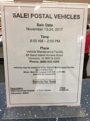 11月30日(木)曇り晴れ 気温26.6 湿度71 5時30分現在 昨日の体重68.1Kg おはようございます。 11月も今日で終わり、ホノルルマラソンまで10日! ひえぇー(笑) さてさて、 実は年一回郵便局で使用していた『車』のセールがあるんです! 日本で言えば公用車の払い下げってところですね。 セールの車は・・・ 2005年シボレーのインパラ4ドアセダン。 走行距離は80651マイル(129041Km) 価格$1...