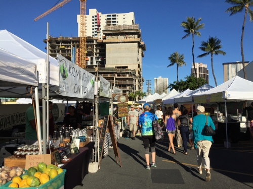 11月18日(土)晴れ 気温27 湿度57 9時25分現在 昨日の体重69.9Kg おはようございます。 今朝は土曜日恒例のカカアコ朝市! 8時過ぎは賑わいをみせています♪ 左に写っているパパイヤは1個$1.00。 大きなパプリカは1個$2.00。 馴染みのお店のパパイヤは1個$1.00で、6個$5.00。 まぁ5個で1個おまけですね♪ 定着してきたお弁当&おにぎり店。...