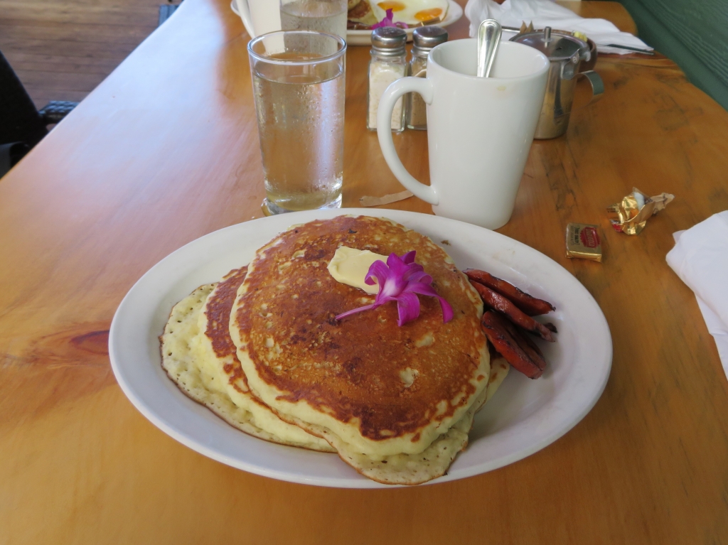 朝食はパンケーキ。 やりたい事リストのひとつを叶えに出発です! 選んだ先はKAILUA-KONAにあるIsland Lava Java。 私はPANCAKE BREAKFAST$10.95(ソーセージを選んでいます) 旦那さんはLAVA JAVA BREAKFAST$12.95(ベーコンを選択) お気付きでしょうか。 このメニューは卵ありかなしかの違いなんです(笑) この差で$2.0-なら無くてもありです。 因みに英語で片面焼きの半熟目玉焼きは sunny side up。 予習していたので伝え...