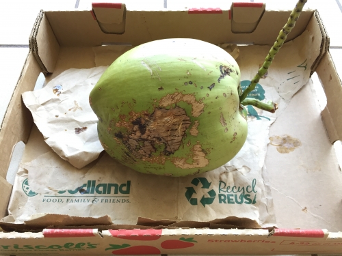 7月7日(金)晴れ 気温27.5 湿度61 6時5分現在 アロハフライデ〜♪ 実はマンゴーと一緒にヤシの実も1個いただいていました ヤシの実って斧や鉈がないとむくの大変なんですよね〜。 一応重さを量ってみたところ3Kgありました。 眺めながら考えましたが・・・ うーんしばらく放っておくことにしました(笑) JUGEMテーマ:ハワイ