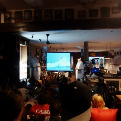 今年もやってきました、このサーフ・フィルム・フェスティバル’OMBAK BALI'。毎年3日間に渡り、夏の時期に行われる、このサーフ・ムービーの上映会。このOMBAK BALIをやっている友達が仲良しのお友達なので、一年かけて、こうやって形にしていくのをみてたから、やっぱり感動する!ああだ、こうだ、というのを聞きながら、こうやって形になったのをみると嬉しい!私のコレクションもそう。一年かけて形にするという。たくさんの人たちでにぎわってる、LA PLANCHA。コンピューターブースの後ろより。やっぱり、しめはこの前に紹介...