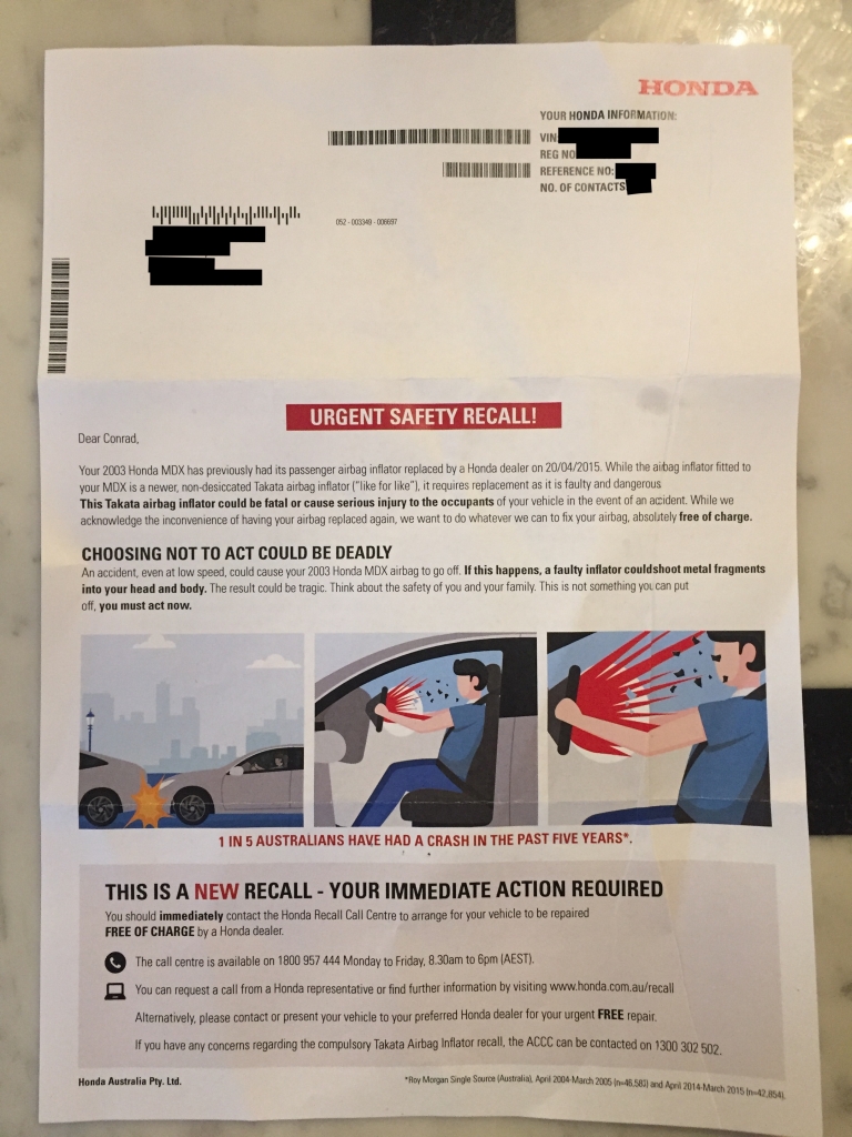 こんにちは。今日は車の話。内容はタイトルの通りです、 買った車にリコールがかかりました マジかよー。どうせなら買う直前にリコールだったらよかったのに・・・ とはいえ無視もしてられず、本日無事に部品の交換をして来たので報告いたします。 元オーナーから連絡 リコールになったのがわかったのは、ちょうど1週間くらい前です。 元オーナーさんの元にリコールの手紙が届き、郵送物を写真に撮って教えてくれました。 あ、写真でお分かり...