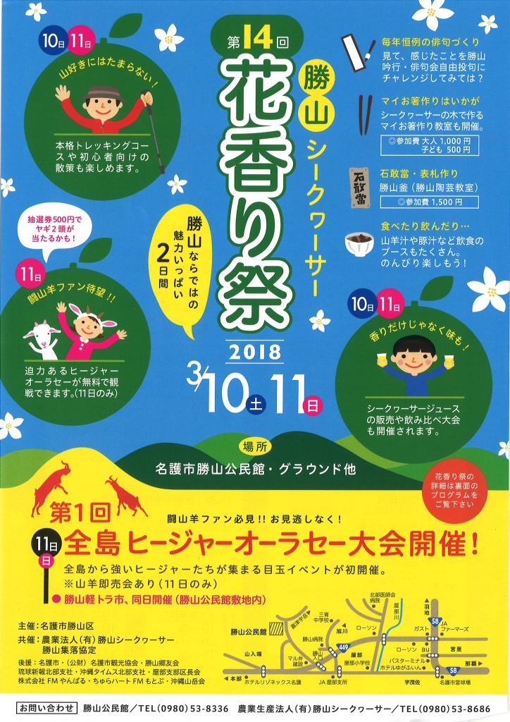 トレッキングあり!ヒージャーオーラセー観戦あり!シークヮーサー 花香りだけじゃなくジュース販売あり!地域によるお祭りです。 皆様のお越しをお待ちしております(^^)/ お問合せ 勝山公民館/☎0980-53-8336