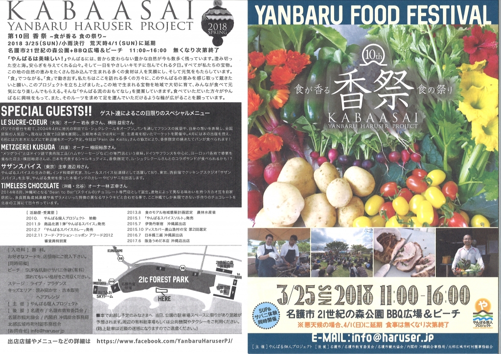 KABAASAI〜食が香る 食の祭り〜 2018.3.25(SAN)小雨決行 荒天気4.1(SAN)に延期 名護市21世紀の森公園+BBQ広場&ビーチ 11:00〜16:00 無くなり次第終了 入場料:無料 主 催:やんばる畑人プロジェクト お問合せ:indo@haruser.jp
