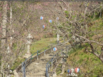 平成27年1月23日(金)現在、名護城公園の桜の開花状況 南口 花はあまり見えない状態 管理事務所前 木によっては5分咲き