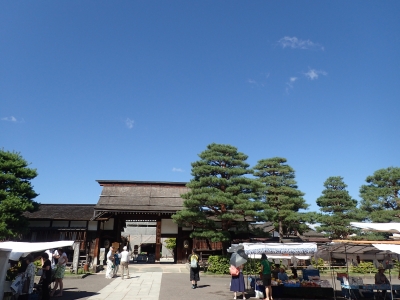 先週、じつに久しぶりに、高山に帰りました。 飛騨も、この夏はいろいろ不順だったそうですが、 この日は、みごとに晴れました。 ご覧ください、この青空。 ここは陣屋前の朝市。 秋晴れというべきか、夏の名残りの空と呼ぶべきか、 日なたにいるとチリチリと肌が焦げるほどだけれども、 空気はからりと乾いて、日陰に入ればすっと汗が引きます。 従姉のYちゃんが出している店で、墓参用に菊の花を買い、 ブルーベリーをおまけにもらう。 Yちゃん、いっつも何かおまけしてくらはる...