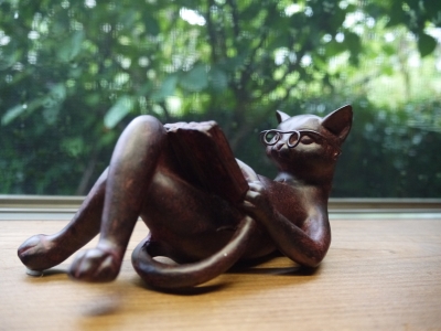 わが家に新規加入メンバーあり。 ご紹介いたしましょう。 こちら、 読み猫さん。 とにかく本が好きなお方で、 一日中、こうして読書にふけっておられます。 * いえね。 夏に高山に帰ったとき、安川通りの道具屋さんで見かけましてね。 つい、ふらふら〜っと...... 以下、 灰色しましまの反応です。 ・ ・ ・ ...