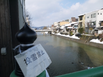 ※にゃんと、書きかけで投稿してしまいました! いきなり「#2」って......、あな恥ずかし。 すでにコメントもお寄せいただいておりますので、 ちょこっと追記などして、このまま公開いたします。 「#1」は、また、明日にでも。(1月21日夜追記)用をすませて宮川を渡り返す、その柳橋の欄干にこんな注意書きが。え、イマドキの高山の子は、雪玉合戦をしてはいかんのか、と、一瞬、勘違い。屋根や道筋からよけた雪を、川に入れてはイカン、というお達しでした。下手に投げ込むと、雪が流れずに下流でつっかえて洪水になりますか...