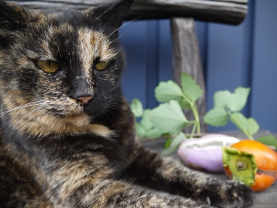 秋の色は、グリコのコートによく似合う。庭の柿の実が、色づいてきました。早いものは、もう食べられます。調子に乗ってかぶりつくと、まだまだ渋いのにも当たりますけれども。アケビの紫は、何ともいえない、よい色です。ほんの二つ三つですが、実ってくれました。*家の中でも、秋の収穫祭。迷惑そうなウリ猫の前に、どん!いつもの、スクナカボチャ。⇒☆比較構文に登場したスクナカボチャことしもR姉ちゃんが持たせてくれたのを、高山からかついで来ました。体長はウリとほぼ同じ、体重はジャスト2.0キログラム。*以下、飛騨高山...