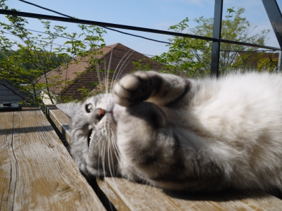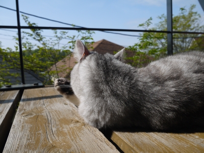 お日さまを浴びると子どもにかえるらしい。わきゃわきゃと自分のしっぽにじゃれていたウリ、つかまえようとしたしっぽを空振りの図。ついでにカメラのピントも、スカッと空振り。さて、高山では、町の観光シンボルである赤い中橋がながらく架け替え工事をしていて渡れませんでした。でも、春祭りにはちゃんと間に合った由。ぴっかぴかの真っ赤っか。記念撮影の観光客で無法地帯になるのが常のこの橋。架け替えで幅を広げたのだそうですが、相も変わらず、車は最徐行を強いられておりました。(いっそ歩行者専用にしちゃえばいいのに。...