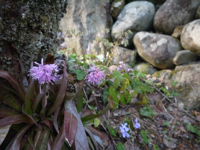 わが家のお墓は町の東、城山の奥にあります。さして深い山ではありませんが、山は山。ヒイコラと自転車を押して上がると、とば口のお茶屋さんの小庭に、ショウジョウバカマ。時あたかもこの花の盛りだったようで、道すがらにもたくさん♪厳しい冬を越した葉っぱはボロボロですが、花はすっくりと顔を上げ、朝の光の中で誇らしげに咲いていました。お墓のあるお寺の境内からは、急な石段がくだっていて、その先には小さな浮御堂があります。夏には、石段を涼しい風が吹きあがり、お墓の草取りでほてったからだに、よい涼み場で...