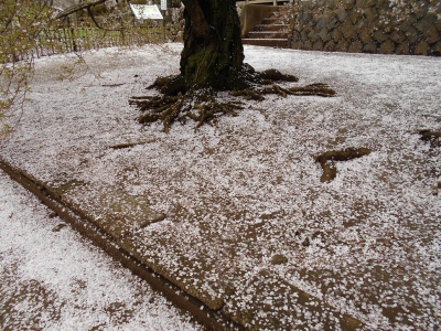 写真−1 境内にあるソメイヨシノの樹が折からの風に煽られて、桜吹雪となって地面を覆い尽くしている。 写真1はその様子で、まるで雪が降り積もった趣きで、黒々とした幹の質感と対照的に引き立ち、足を踏み入れるには憚れる美しさ。 桜はその時々の見頃があって、俳句歳時記の桜にはそれぞれ典雅な呼び方があり、今は散り桜でその後若葉桜になる。写真−2 写真2は実相寺境内に植えられている五大桜の『三春滝桜』の子孫で、苗木を育てている。 淡墨桜もあって、この境内に五大桜全部を植えて観せようとする趣向だろうが、まだ写真...