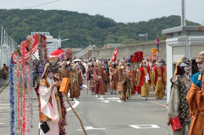 百面・面被 仮面、面掛をかぶり、行列する一団。百面です。 今年も多くの子供泣かした百面。よく泣いた子供は、無病息災に育ちます。