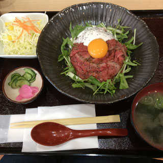 庄内観光物産館から再びバスにのって 鶴岡駅方面へ向かいますが、お昼を食べなくてはいけません。 前もって調べておいたお店にに近い「農学部前」バス停で下車。 地図を見ながら「肉屋食堂」へ。 お肉屋さんを改装して食堂になったところだそう。 狭いお店にお客さんが結構いたけど、 ちょうど席が空いていたので待たずにすみました。 フライやカツも気になるのですが、 私はイチオシのローストビーフ丼。 味の付いたご飯がローストビーフにくるまれています。 黄身をつぶして絡め...