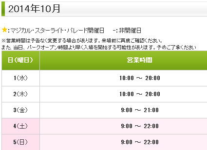 今日は、こんな営業時間じゃなかった。という話を。 詳しい営業時間は覚えていないのですが、8月初旬に発表されていた2014年9月・10月・11月の営業時間に、午後10時まで営業する日はなかったように記憶しています。 それが今日見てみると、9月中旬から11月初旬にかけての週末と月曜日は、午後10時まで開園するようなのです。 ワタシがブログを書き始めてから、ハロウィーン期間中、こんなに長い営業時間が続くことは記憶ありません。 一番大きな理由は2014年9月12日〜2014年11月9日まで開催されてるハロウィー...