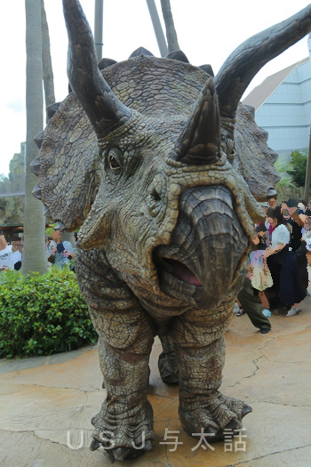 子供のころ、恐竜図鑑を見ていて一番興味をそそられたのが『トリケラトプス』でした。 人それぞれ好みがあるでしょうが、ワタシが興味を持った一番の理由はそのビジュアル。 肉食とか草食とか、走るのが早いとか、そんなことはどうでもよくて、とにかくカッコイイ! そう思ったのを覚えています。 このトリケラトプスを、USJで見ることが出来るのです↓ これはダイナソー・パニックというアトラクションの一場面。 ゲストの中をトリケラトプスがゆったりと歩いています。 わりと近くに近寄れるので...