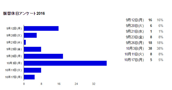現在行っている『秋の学校行事における振り替え休日アンケート』について、ちょっと報告してみます。 今週は、明日の月曜日が敬老の日、木曜日が秋分の日となっているシルバーウィーク。 そんなことで、振替休日にバラツキが出ています。 では、昨日午後2時頃の集計を見てもらいましょう↓ アレコレ書く前にお断りを。 最初のアンケートで表記間違いがあり、それを修正したら、対象の曜日がリセットされてしまったので、以下のように補正が必要となっています。 9月20日(火)はプラス4 9月21日(水)はプラス...