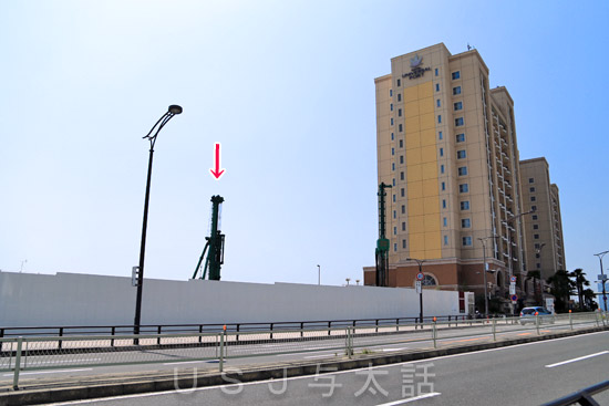 ホテルユニバーサルポートの北(北東)隣に、ユニバーサルシティの船着き場に向かう道路がありまして、その細い道路を挟んだところに、着工途中のホテルが野ざらしになっていたところがありました。 その後、結婚式場ができるという話もあったのですが、再び放置… そこに先日、何やらボーリングをしているような重機が入っていたのです↓ 何が始まったのかと近寄ってみると、竹中工務店が工事をしていまして、下のような建築計画が表示されていました↓ この写真だと文字が小さくてて読みにくいですよね(^▽^;) ち...
