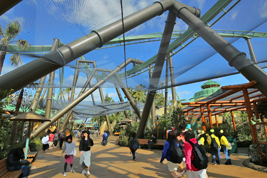 グランドオープン初日は12時間待ちという、とんでもない待ち時間になっていた、ザ・フライング・ダイナソー。 混むことは予想できたものの、まさかここまでとは思いませんでした。 先週、予想が外れてプレオープンで乗れなかったので、この状況が続くと、しばらくというか、年内は乗れないかもしれないと感じております。 このザ・フライング・ダイナソーで懸念していたことがありました。 それは、レールの下に取りつけられる防護ネットです。 ジュラシックパーク全域にレールが施設されたので、どこを見ても防...