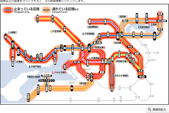 ツイッターのほうが良いのかもしれませんが、ブログに書くことにしました。 2015年7月18日午前7度40分現在、USJへの大動脈、JRゆめ咲線・大阪環状線が台風11号の大雨の影響で止まっています。 赤く縁どられた路線が止まっています↓ (2015年7月18日午前7度40分現在の情報です) JRゆめ咲線・大阪環状線の他にも多くの路線が止まっているので、今日、USJ 行かれる方は注意してください。 一昨日から降り続いた雨は、今はやんでいるのですが、影響が出ているようです。 詳しくは、JR西日本のHPをご覧ください。 ...
