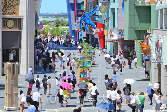 海の日の祝日にUSJに行ったところ、ザ パーク フロント ホテル アット ユニバーサル・スタジオ・ジャパン(長い…)のテナントと、シティウォークを仕切っていた低い塀が撤去されていたのです! テナントはホテル本体よりも一足早く、今日、7月22日にオープンします。 海の日はプレオープンだったのか、数店舗に人が入っているのが見えました。 ショップのオープンも嬉しいのですが、ワタシはこれまでに何度か書いたように、通路が広くなるのが楽しみだったのです。 すでに低い塀になって、開放感は感じていたものの...