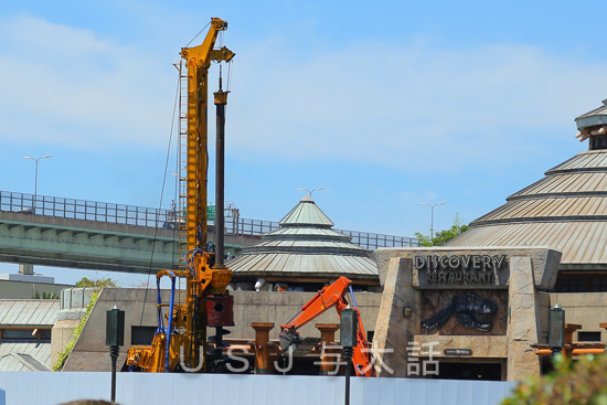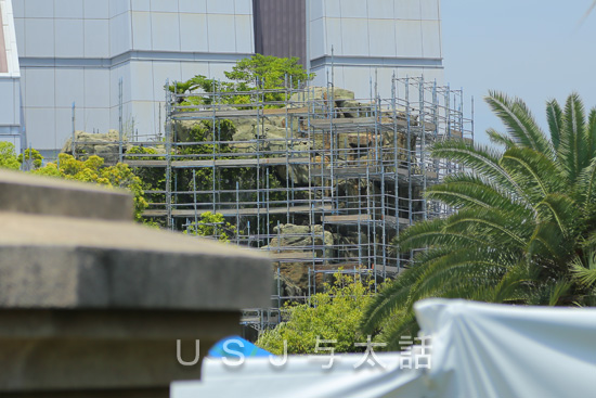 パーク内の建物や何気なく置いてあるものには『エイジング加工』という、経年劣化したように見せる加工をしてあるものが多くあります。 いや 劣化じゃなく、古く見せる加工というのでしょうかね。 こういったことに詳しくないのですが、ともかく、新しく作られているのに、わざと古びたように見せる加工のことです。 現在、エリア全体がクローズしているジュラシックパークでは、普段されない場所に、このようなメンテナンスが行われていたのが、サンフランシスコエリアから見えていました。 足場が組まれて分かり...