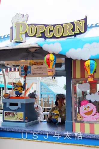 サンフランシスコエリアを歩いていて、レストラン、ドラゴンズパールの前に来た時でした。 ワゴン販売のお店に行列ができているのが目に入りました。 さすがゴールデンウィーク中やと思いながら前を通りかかった時、「なるほど」と思ったのは、このキャラのポップコーンバケツが販売されていたからです。 店先にはエルモとモッピーが乗った気球型のポップコーンバケツがぶら下がっていますね。 ここではこの形のポップコーンバケツしか販売されていなかったのです。 でも、クルーが手にしているポップコーンバケ...