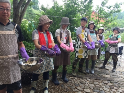 JUGEMテーマ:クラフト・手芸 色々 JUGEMテーマ:着物 きもの JUGEMテーマ:京都 ←クリックして頂けるとうれしいです。 草木染めワークショップ2日目は人数も少し増えて8名です。 暑くなりましたが、染料で火傷をしないように、軍手と厚手のゴム手袋をします。 絹の帯揚げを各自染めます。 まず、染下の帯揚げを湯で洗い、埃や油分を洗い流します。 そして、昨日煮出した桜の染液に漬けて染料を吸わせます。 &n...