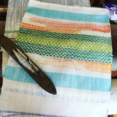 JUGEMテーマ:着物 きもの JUGEMテーマ:京都 ←クリックして頂けるとうれしいです。 西村です。 先日当ブログでもお伝えしましたが、きものsalonさんと一緒に織りのワークショップを開催しました。 その時にジャガード織をされた方の作品です。 寸法は8寸ほど。 器用な方で、覚えるのが早かったです。 好きな色を選んでもらい自由に織ってもらいます。 オレンジの部分は絣の糸を使っています。 カラ...