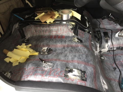 時おり雨の降る蒸し暑い土曜日。 遮熱対策の続きです。 まずはフロントシートのすべてのカーペットを外しました。 ついでに何という部品かは知らないけど、足元にあったプラスチック製カバーもすべて外し、ドアのカバーも外してかなりスパルタンな装いに(笑) 果たして元に戻せるのかしら(汗) こうなったら、とにかく先に進むしかありません。 やり残してた運転席の型取り。 続いて、ひざ元から床面、前方の壁まですべてカバーできる型取り。 出来上がった...