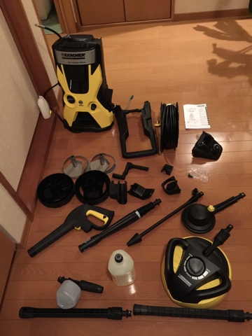 週末のケルヒャー K5 サイレントカー&ホームキット使用に備えて、中身を確認しようと箱を開けてみました。 すると、部品が出てくる出てくる!(汗) これって組み立てが必要な機械だったのですね〜! そんなコト知らずに買ってました。 とりあえず説明書の部品確認ページの順番に並べてみました。 部品はすべてそろっているようです。 今から組み立てます。 あ〜、面倒くせー(^^; ということで、取説と睨めっこしながら、けっこうな時間をかけ組み立てました。 なんだか、ロボッ...