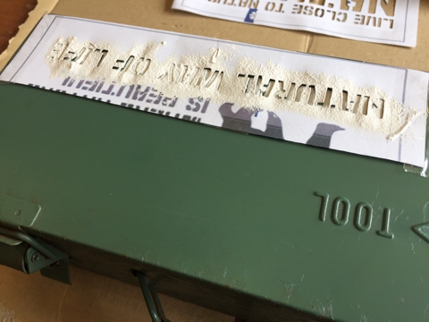 工具箱をキャンプ道具の入れ物として使う話は前回書きましたが、それだけでは少しつまらないような気がして・・・。 文字を入れてカッコよくしようと思い立ちました。 ネットで使えそうなモノを印刷して、カッターナイフでカッティング。 けっこう時間がかかりましたが、それを工具箱に貼り付け水性ペイントとスポンジで塗っていきます。 スプレー塗装も考えたけど、全体をカバーする手間を考えたらこっちの方が簡単そうだったので・・。 普通のコピー用紙なので、水性ペイントだと水を吸っ...
