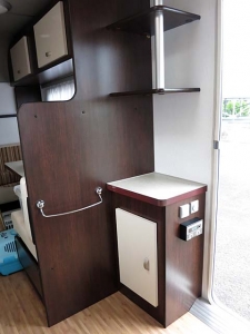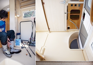残りの後ろ半分です(笑) エントランス右手には、チョットした飾り棚(?)があります。 牽引中は揺れるので物は置いておけませんが、設置後は何かと便利なスペースです。 下の物入れは外部電源のケーブルなどの小物を入れており、設置後は下足入れにも使っています。 側面には照明のスイッチと外部電源コンセント、AVモニターが付いています。 このAVモニターで現在のバッテリーの状態や電気の使用量を知ることが出来ますし、充電量低下のアラームも鳴ります。 冷蔵庫の隣にはFFヒーター(LPG)があります。 FFヒーター...