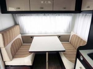 キャンピングトレーラー「エースキャラバンズ プロジェクト375ET Jエディション」の中です。 左側のエントランスを入るとすぐ左側(前側)にダイネットがあります。 4人でゆったり食事が出来る大きさがあります。 ソファの下には空間が有り、右側のソファの下には給水用のポンプ、温水ボイラー、バッテリー、インバーターなどが設置されています。 足元にはガス警報器、インバーターのスイッチ・モニターと100Vのコンセント(バッテリーからインバーター経由)があります。 左側のソファの下は物入れになっていて、アウ...