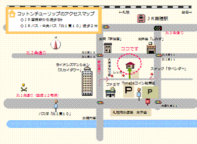 ホームページの地図、直しました。 サンクスがファミマになった時以来の改正です。 修正ポイント 2018年11月17日にJR苗穂駅が移転開業しました。 ◆2019年、駅の南口を出てすぐ、北三条通を南に渡る信号機が 設置されました。 ◆2019年、北1条東11丁目のセコマが閉店し建物が撤去、駐車場になりました。 ■■■■■■■■■■■■■■■■■■■■■■■■ ---------コットンチューリップお問合わせ先-------- 電話・FAX:011-206-061...