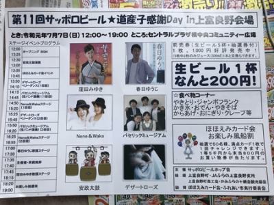 JUGEMテーマ:北海道 2019年 7月7日(日曜日) 上富良野 天候:晴れ 最高気温:+28.7℃ 最低気温:+14.9℃ 日曜日。この日は「サッポロビール 道産子(どさんこ)感謝Day」というイベントがあった日です。 新聞の折り込みチラシ。 イベントも盛り沢山で楽しくなりそうな日に感じました。 上富良野町はサッポロビールに関係のある町。 サッポロビールの「サッポロビール? バイオ研究開発部 北海道原料研究...