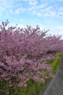 3月3日、ひな祭りの時、春を追いかけて東伊豆の河津に河津桜を見に行ってきました。 ちょうど満開の時、木によっては少し葉も出てきているくらいでお天気も曇と晴れで、昼の散策にはばっちりの天候でした。 伊豆は暖かいとはいえ、北風が冷たくって、ライトダウンジャケットで歩き回ってちょうど良い感じでした。 河津桜は染井吉野などに比べて色が濃く、ピンクの色が菜の花の黄色とマッチして、 とても華やか 駅を出てすぐのあたりです。 そのまま川辺を歩いて行くのですが、道の片側に桜があり、もう一方は露天商がた...