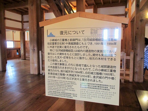 いよいよ、白河小峰城の「三重櫓」に入ります… 小峰城の三重櫓と前御門は「白河城御櫓絵図(福島県指定需要文化財)」 や発掘調査にもとづき、1991年と1994年に木造で忠実に復元されたものです。 特に「白河城御櫓絵図」は城内の建造物の実測図であり、復元はこの資料をもとに 設計しました。この復元事業はのちに各地で盛んとなった 城郭建造物の木造復元のさきがけとなったもので、 この小峰城三重櫓復元ののち、掛川天守(1994年)、 白石城三階櫓(1995年)、新発田城三階櫓・大洲城天守(2004...