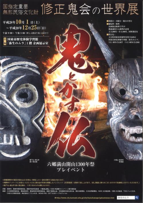 鬼会面など100点展示 「修正鬼会の世界展 〜鬼とかす仏〜」 大分県国東市「弥生のムラ」にて10月1日(土曜日)〜12月25日(日曜日) http://www.oita-press.co.jp/1010000000/2016/10/02/JD0055061686 日本の歴史を紐解く上でかかせない鬼という存在。 ↓ ↓ にほんブログ村 JUGEMテーマ:ご当地イベント
