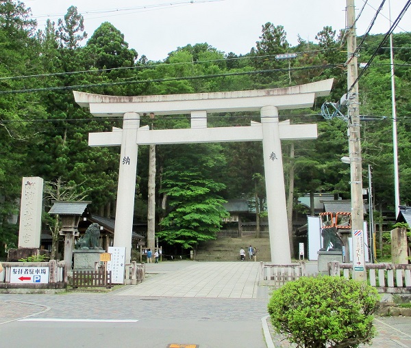 諏訪大社上社本宮 拝殿に来ました。 諏訪家の家紋である「梶の木」がありました。 葉っぱがあおあおと。 参拝所からの眺め。 さすがに素晴らしいですね…。 JUGEMテーマ:おでかけ・散歩