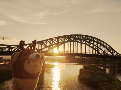 旭川のシンボル、旭橋。精霊流しのあったこの日、夕日がきれいだったのできゅんちゃんと撮影。 下を流れるのは石狩川だよ。冬は川霧があがって、この橋を渡るのは筆舌に尽くしがたい凍える寒さ。高校生の時はよく歩いて渡りました。高校生の頃とは中州の風景がずいぶん変わりましたよ。 今はほんとにいい季節ですね。これからあっという間に寒くなるよーーーだって今もうテレビでスタッドレスの」CM流れてんの。もすこししたらストーブも来るよ。こっち、夏休みは終わりだからね。夏休み終わったらもう秋から冬へま...