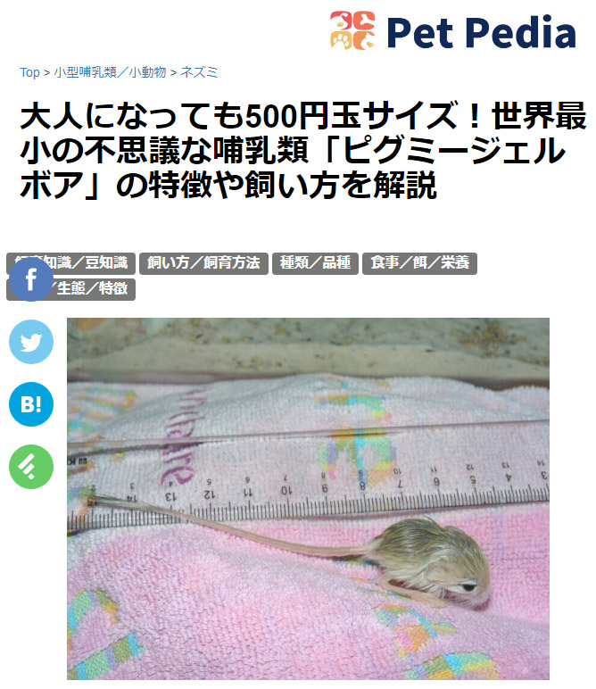 PET PEDIA でピグミージェルボアを紹介してもらいました! ピグミージェルボアの生態、出身地や 飼い方、気をつけないといけないこと 入手方法・・・などなどなど とても丁寧でしっかりとした記事です 是非見てくださいね! ライターの三日月様、Pet Pedia様ありがとうございます! サイトには色々なペットや動物の記事が沢山あります この機会に色々見てくださいね PET PEDIA 記事の一番下に紹介していただいた ピグミージ...