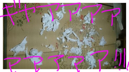 JUGEMテーマ:かわいい動物たち あいつ…!!!! またやりやがった!!!! (# ゚Д゚)!!! トイレットペーパーがぁぁぁぁぁ!!!!!! 出て来いやぁ(# ゚Д゚)!!!! お前っちゅーことはわかっとるんじゃぁあああああ!!!!!! 尻が出てんだよ!!!! 全然隠れてないから! 出てるから! しばらく出てきませんでした… んにゃろ(# ゚Д゚)