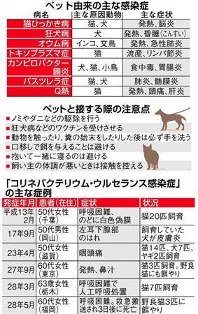 ペット由来の主な感染症 ■「動物と適度な距離を」 専門家、飼い主に注意促す 犬や猫などから人間にうつるとされる人獣共通感染症「コリネバクテリウム・ウルセランス感染症」で国内初の死亡例が発覚し、ペットの飼い主らに動揺が広がっている。亡くなった福岡県の60代女性は猫の餌やりからの感染が疑われた。ペットや野良猫から人間にうつる病気は多く、専門家は「動物とは適度な距離を保って」と呼びかける。 「近所の野良猫は大丈夫か」。飲食店が多く、ネズミ対策として多くの野良猫がいる東京都台東区の保健所...