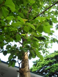 仕事で通っている校内に色々な樹が植えられていて、花と実を付けている。 写真上は道路上に落ちている実で、見た感じはドリアンのようでもあり、小さいジャック・フルーツのように見え、大きさは大きいソフトボール大。 この実が毎朝通る路上にたくさん転がっていて、車に無造作に踏み潰されているから喜んで食べる果実ではないようだ。 この実を落とす樹はかなりの大木で、直径は1メートル以上、高さも20メート以上はあって、この樹の幹に学名が英語で書かれていて調べた。 学名は『Anthocephalus chinensis』といって、インド...